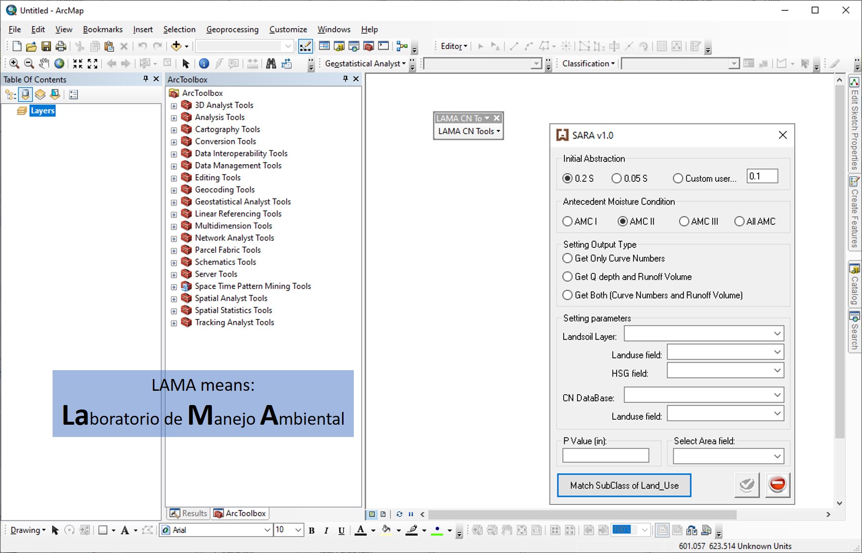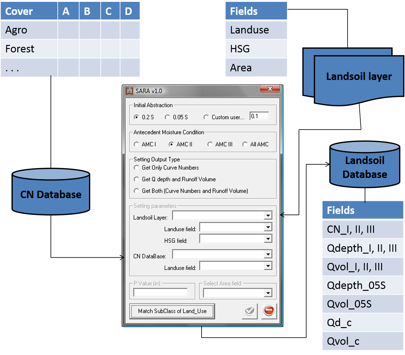 SARA is an interface to estimate curve number and runoff volume for hydrologic evaluations. This version runs in a vector platform as with other extensions of ArcGIS, introducing changes to the original Natural Resources Conservation Services-Curve Number method, and allowing adaptation to local conditions. The programming syntax was developed in Visual Basic 6.0 as an ActiveX Dynamic Link Library (DLL) to interact with ArcMap, and it is released as Free and Open Source Software (FOSS) that can be modified or upgraded to other programming languages.