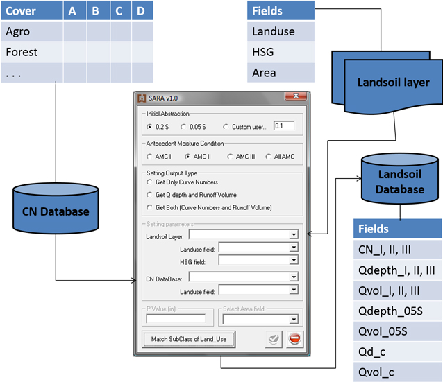 SARA is an interface to estimate curve number and runoff volume for hydrologic evaluations. This version runs in a vector platform as with other extensions of ArcGIS, introducing changes to the original Natural Resources Conservation Services-Curve Number method, and allowing adaptation to local conditions. The programming syntax was developed in Visual Basic 6.0 as an ActiveX Dynamic Link Library (DLL) to interact with ArcMap, and it is released as Free and Open Source Software (FOSS) that can be modified or upgraded to other programming languages.